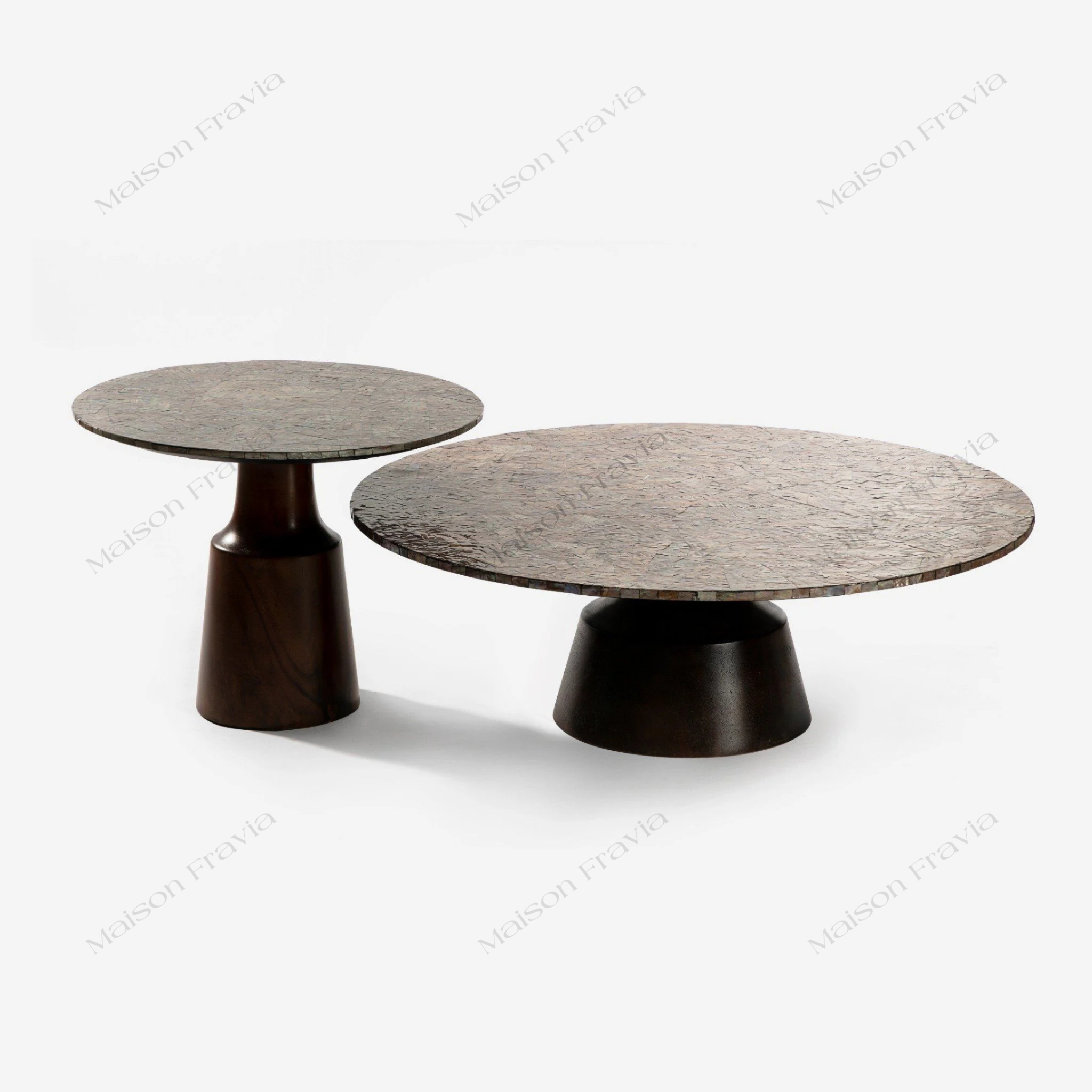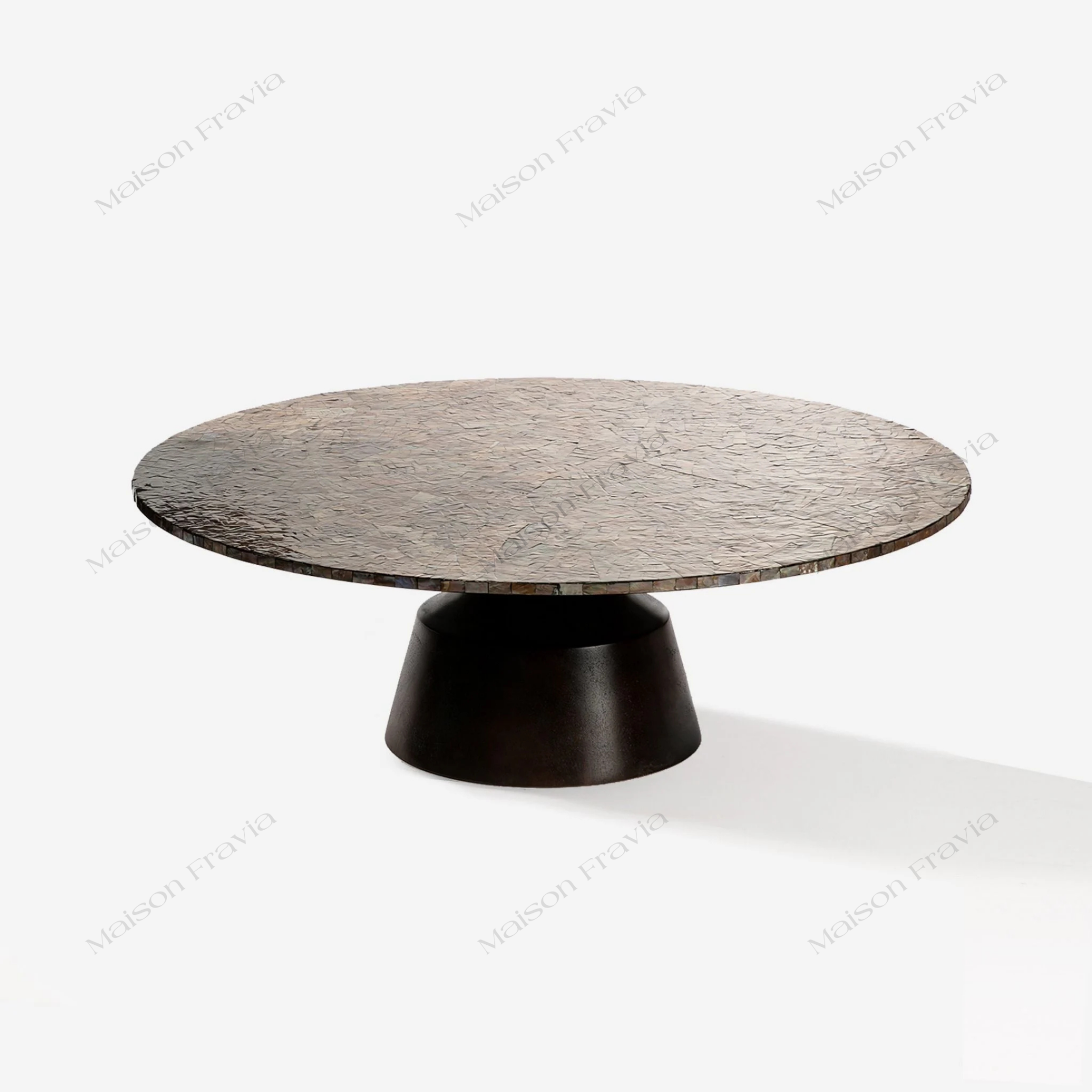 Tấm mặt bàn được khảm từ những mảnh xà cừ nhỏ, được tuyển chọn kỹ lưỡng từ các vùng biển trên thế giới. Những mảnh xà cừ này được sắp xếp tỉ mỉ theo các quy tắc nghệ thuật, tạo nên những hoa văn, họa tiết đa sắc màu, bắt mắt và rực rỡ.